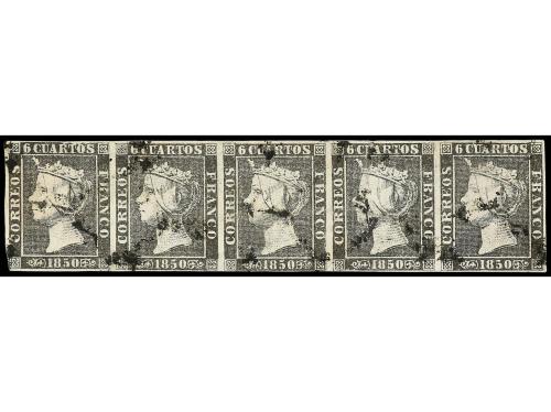 ° ESPAÑA. Ed. 1A (5). 6 cuartos negro. Tira de cinco, márgenes completos. Leve pliegue horizontal sin importancia.