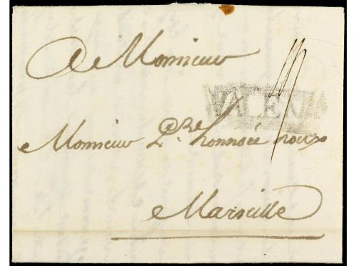 ✉ ESPAÑA: PREFILATELIA. 1749. VALENCIA a MARSELLA. Marca en negro VALENCIA en recuadro, similar a (P.E. 7 y P.E. 8) pero con una letra "A" pequeña fuera del recuadro. PRECIOSA y de EXTREMA RAREZA.