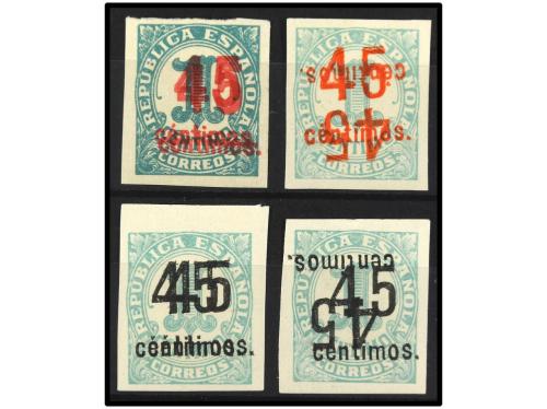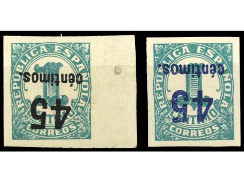 * ESPAÑA. Ed. 742hh y hhi. 45 cts. s. 1 cto. verde. Cuatro sellos HABILITACIONES DOBLES, dos INVERTIDAS en rojo y negro.