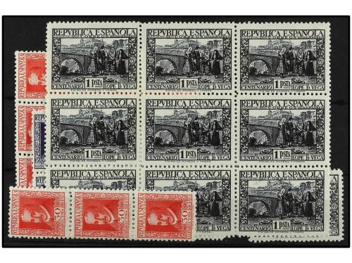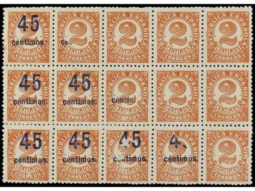 **/* ESPAÑA. Ed. 743 (15). 45 cts. s. 2 cts. castaño rojo. Bloque de 15 IMPRESIÓN PARCIAL DE LA SOBRECARGA. ESPECTACULAR y RARO.