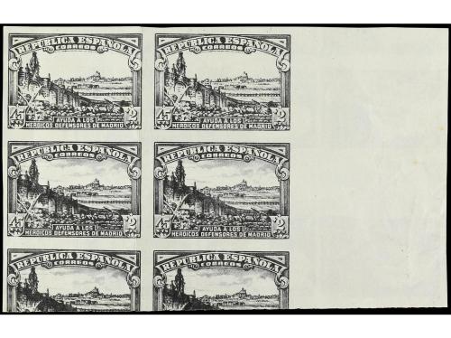 * ESPAÑA. Ed. 744(6). 45 cts. s. 2 cts. castaño. Bloque de seis, dos sellos SIN HABILITACIÓN y cuatro sellos con HABILITACIÓN DOBLE. RARO.