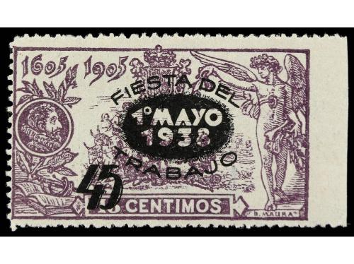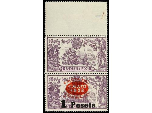 ** ESPAÑA. Ed. 762haph. 1 pta. s. 15 cts. violeta. HABILITACIÓN "FIESTA DEL TRABAJO" en rojo y "1 PESETA" en negro, un sello sin habilitación. RARÍSIMA, sólo existen 5 parejas. Cert. COMEX.