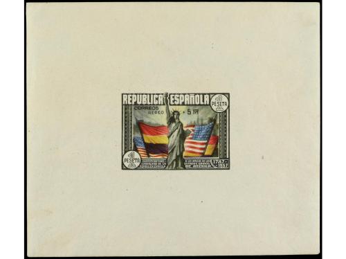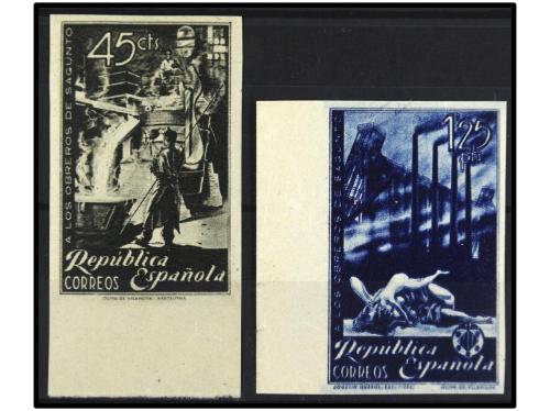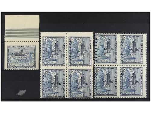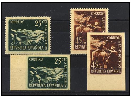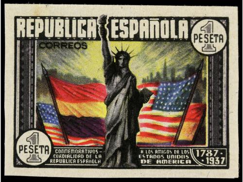 ESPAÑA. 1938. CONSTITUCIÓN. Colección especializada montada en hojas clasificador que comprende hojas sobrecargadas y variedades de Edifil 766. Incluye pruebas, variedades fondo (incluyendo ** 766b sólo existen 10), variedad sin dentar (* 766s sólo existen 100), variedad habilitación invertida (** 766hi sólo existen 50), pareja (*) 764 + 766, variedad fondo desplazado, etc. Alguna hoja tipo, levemente tonalizada. También se incluyen dos ejemplares con habilitación falsa. Gran conjunto. EXAMINAR. Valor Edifil, lo catalogado, aprox. 42.000Ђ. Foto en web.
