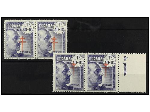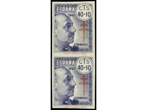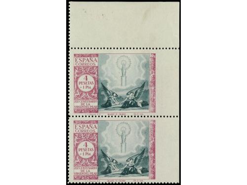 ** ESPAÑA. Ed. 938ets. 40 + 10 cts. azul y rojo. Pareja vertical, pie de imprenta en rojo. Cat. 190€.