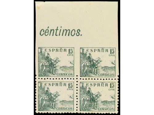 ** ESPAÑA. Ed. 918dmz. 15 cts. verde. Dentado sólo el margen inferior. Bloque de cuatro con los dos superiores con esta variedad no catalogada. RARO.