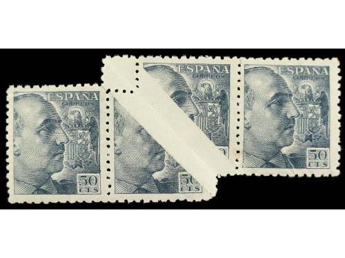 ** ESPAÑA. Ed. 927iw. 50 cts. gris. Tira de 3, un sello GRAN FUELLE DEL PAPEL. ESPECTACULAR y RARO. No reseñado.