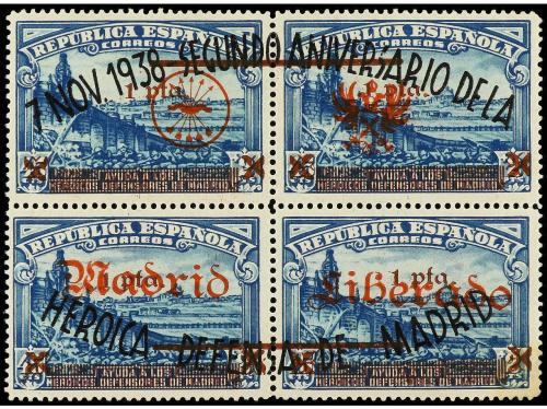 ** ESPAÑA E. LOCALES PATRIOTICAS: MADRID. Ed. 52. Bloque de cuatro habilitados. Leve mancha en esquina inferior derecha. Tirada 30 ejemplares. MUY RARO. Cert. COMEX.