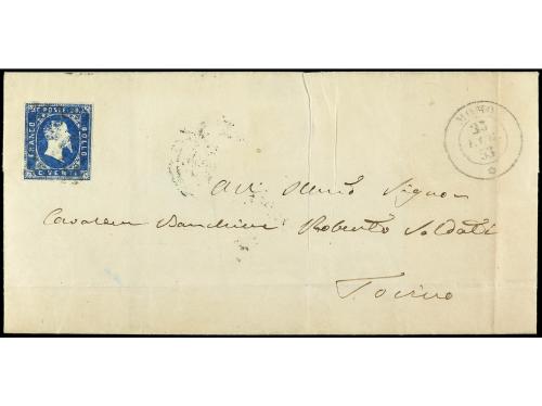 ✉ ITALIA ANTIGUOS ESTADOS: CERDEÑA. Sa. 8c. 1855. NIZZA a TORINO. 20 cts. azul oscuro, márgenes excepcionales, uno borde de hoja.