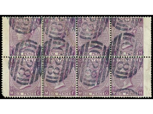 URUGUAY. 6 d. lila. Bloque de ocho, mat. C-28 en azul de la B.P.O. de MONTEVIDEO. PRECIOSO y MUY RARO. (Z13, +1.040 £).