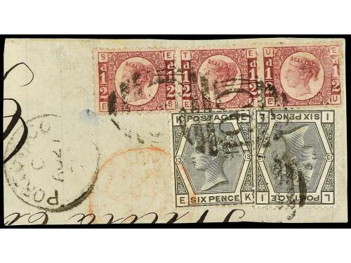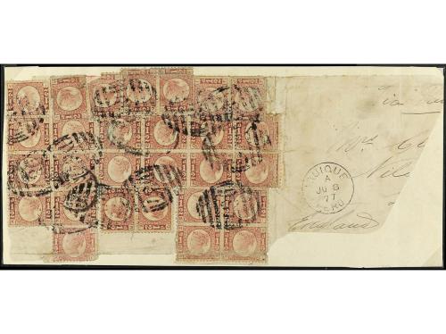 Δ PERU. 1877. Gran fragmento de carta circulada de IQUIQUE a INGLATERRA con franqueo de 28 sellos de 1/2 d. rosa, mat. D-87 de la B.P.O. de IQUIQUE. Defecto pero excepcional franqueo.