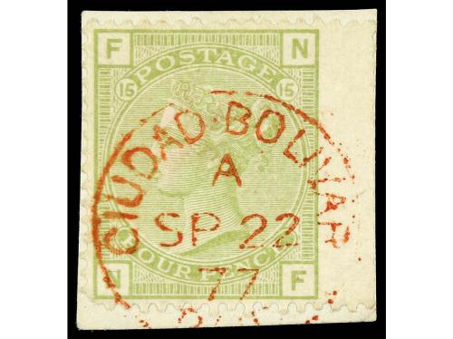 Δ VENEZUELA. 4 d. verde sobre fragmento, mat. fechador de la B.P.O. CIUDAD BOLIVAR / PAID en rojo (Z6, 450 £).