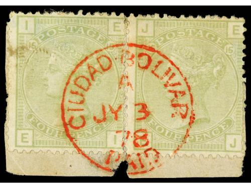 Δ VENEZUELA. 4 d. verde, dos sellos sobre fragmento con mat. fechador de la B.P.O. CIUDAD BOLIVAR / PAID en rojo (SG. Z6, +900 £).