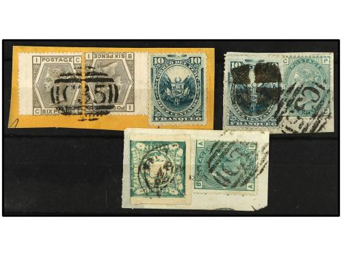 Δ PERU. Tres fragmentos con franqueos mixtos Perú-Gran Bretaña con mat. C-35 de la B.P.O. de PANAMÁ estampado en tránsito.