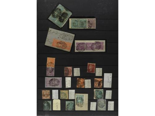 º Δ PUERTO RICO. 1865-80. Dos páginas álbum con sellos británicos con matasellos C-61 de la B.P.O. de SAN JUAN, diversos sellos incluyendo cinco fragmentos (SG. +3.800 £).