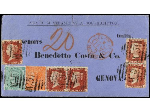 ✉ PERU. 1874. LIMA a GÉNOVA. Circulada con sellos de Perú de 10 cts. bermellón (2) mat. Lima y sellos británicos en anverso y reverso de 1 d. rojo, 6 d. gris (4) y 1 sh. verde (2), mat. de la B.P.O. C-38 de CALLAO. Tránsito por Londres y llegada. Espectacular franqueo. Cert. B.P.A.'2004.