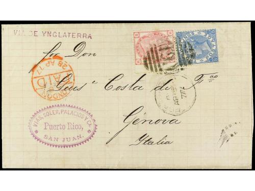 PUERTO RICO. 1877. S. JUAN a GÉNOVA. Circulada con sellos británicos de 3 d. rosa y 2 sh. azul mat. de la B.P.O. C-61 de San Juan, tránsito por Londres y llegada. Muy raro el 2 sh. azul usado en Puerto Rico.