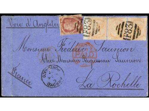 ✉ PUERTO RICO. 1877. ARROYO a FRANCIA. Circulada con sellos británicos de 1/2 d. carmín y 4 d. naranja (3) de B.P.O. F-83 de Arroyo. Tránsito por Londres y llegada. RARÍSIMA. Cert. B.P.A ' 87.