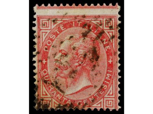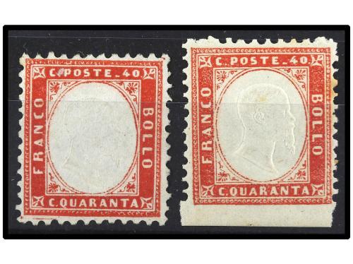 (*) ITALIA. Sa. 3 y 3 k. 1862. 40 c. rojo carmín. 1 ejemplar sin goma (firmado BRUN) y 1 ejemplar con goma, variedad SIN DENTAR en la base (firmado Diena), con sombra del tiempo. Cat. 890€.