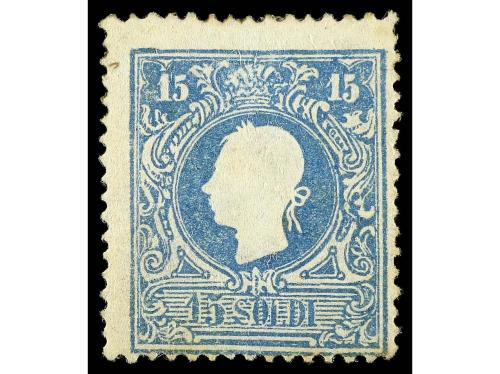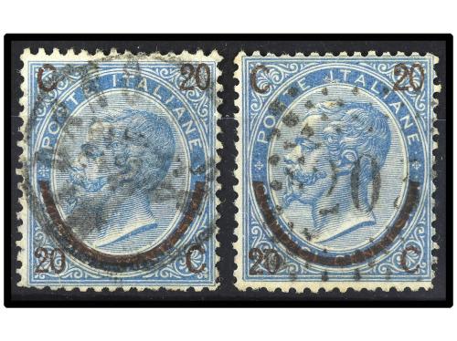 ° ITALIA. Sa. 23ka y 25ka. 1865. 25 c. s. 15 c. azul. Variedad FILIGRANA LETRAS (parcial). Tipos I y III. 23 Ka cert. G. BIONDI. Cat. 1.700€.