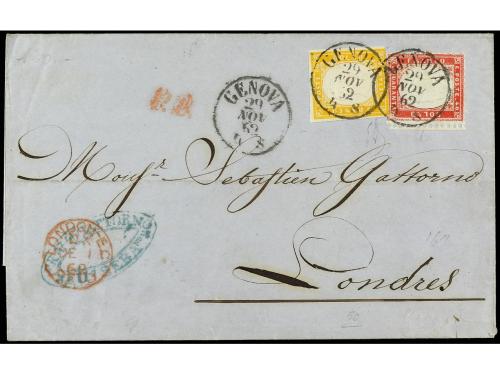 ✉ ITALIA. Sa. 3 y Cerdeña 17D. 1862. GÉNOVA a LONDRES. 40 cts. rojo y sello de Cerdeña de 80 cts. amarillo. Muy bonita.