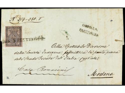 ✉ ITALIA ANTIGUOS ESTADOS: MODENA. Sa. 3, 7. 1859 (1 octubre). ALBERONE a MANTOVA. 5 cents. negro s. verde y 15 cent. negro s. amarillo. Grandes márgenes. Tasada con 5 cents. en MILANO.