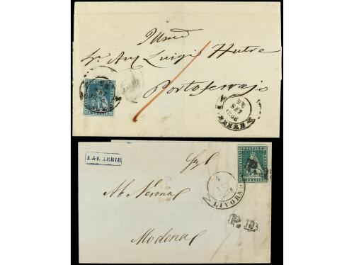 ✉ ITALIA. Sa. S-14 (2). 1861-63. Dos cartas con sello de 10 cts. oliva y 10 cts. bistre usados en SORANO y S. ANGELO LOMBARDO. Muy bonitos.