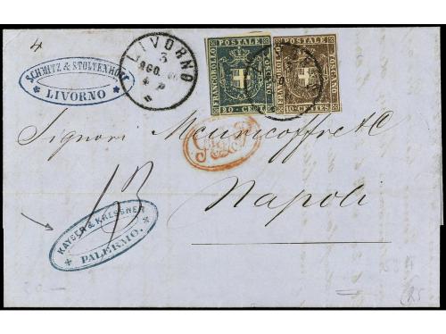 ✉ ITALIA ANTIGUOS ESTADOS: TOSCANA. Sa. 19, 20. 1860. PALERMO a NÁPOLES. Encaminada vía Livorno (marca en el frente de encaminador Schwmitz & Stoltenhoff) y allí franqueada con sellos de 10 cts. castaño y 20 cts. verde. MUY INTERESANTE.