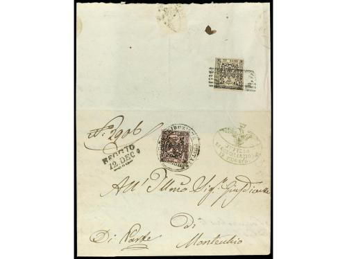 ✉ ITALIA. Sa. 20 (3), 21 (3). 1866. ARENZANO a PUEBLA (México). 40 cts. rosa (3) y 60 cts. lila (3) tasada a la llegada con 8 reales para el pago del porte interno de Veracruz a Puebla. RARA.