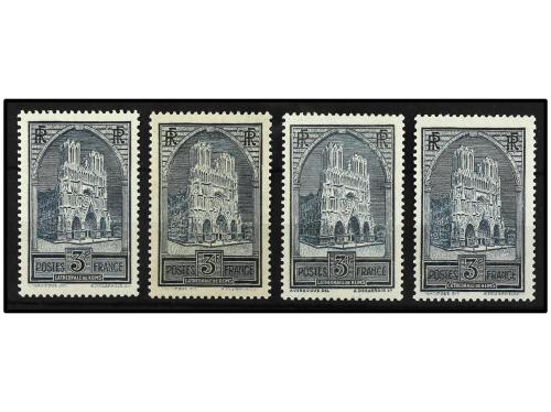 **/* FRANCIA. Yv. 259 a, b, c. 3 f. pizarra. Cuatro sellos, tipos I, II, III y IV. Tipos I y IV sin fijasellos. Cat. 890€.
