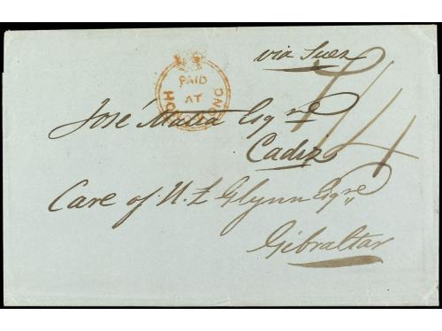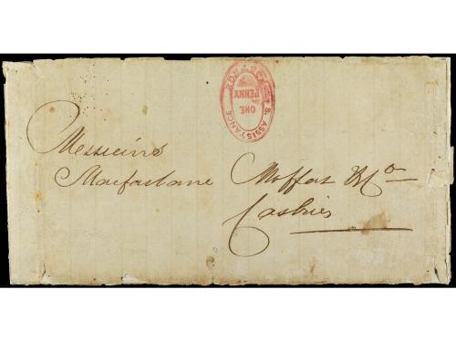 ✉ COLONIAS INGLESAS. 1855. ARICA (Perú) a SAN FRANCISCO (U.S.A.). Envuelta circulada con la marca PAID/AT/ARICA y fechador de doble círculo, tasada con 20 cent. a la llegada. Muy bonita y MUY RARA. Cert. B.P.A.