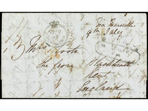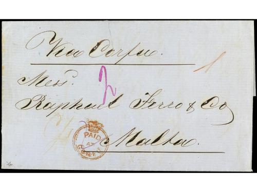 ✉ COLONIAS INGLESAS. 1863. BANTE (Ionian Islands) a MALTA. Envuelta circulada con la marca PAID/AT/CORFU en rojo, al dorso fechador Zakynthos y llegada. Rarísima marca en este color no reseñada en Parmenter, aparentemente solo dos conocidas.
