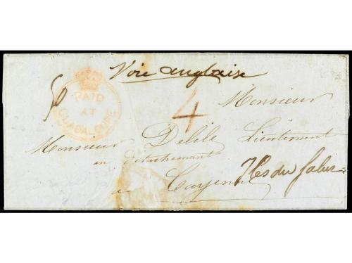 ✉ COLONIAS INGLESAS. 1853. GUADALOUPE a CAYENNE (Guayana Francesa). Envuelta circulada con la marca PAID/AT/GUADALOUPE tipo CC1 en rojo, tarifa manuscrita "4".