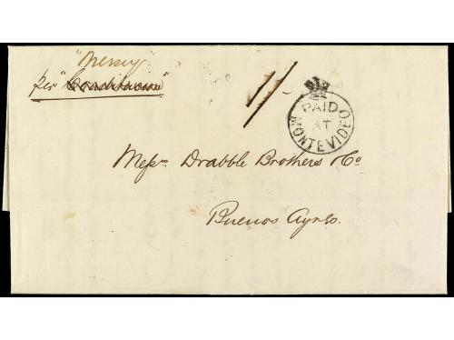 ✉ COLONIAS INGLESAS. 1861. MONTEVIDEO (Uruguay) a BUENOS AIRES. Carta completa con texto, marca PAID/AT/MONTEVIDEO, tarifa manuscrita "1/-" , al dorso fechador de doble círculo de Montevideo. PRECIOSA.