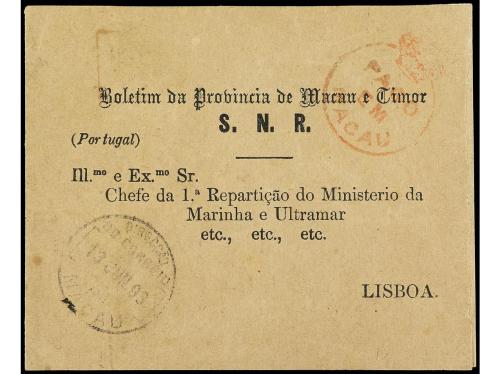 ✉ COLONIAS INGLESAS. 1893. FAJA DE PRENSA (falta parte del dorso) circulada de MACAO a LISBOA con la marca PAGO/EM/MACAO y fechador en negro. MUY RARO.