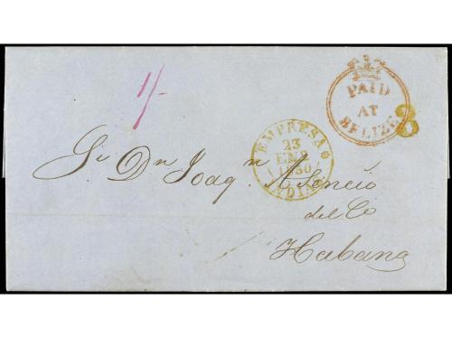 ✉ COLONIAS INGLESAS. 1855. HABANA (Cuba) a ZACATECAS (México). Carta completa con texto, marca PAID/AT/HAVANA tipo CC2, tarifa manuscrita "1/-" y enfrente tasa de 4 reales y fechador de Veracruz.