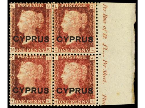 * CHIPRE. Yv. 2. 1 p. rojo, bloque de cuatro, esquina de pliego. PRECIOSO. LUJO.