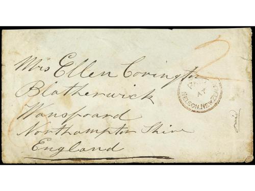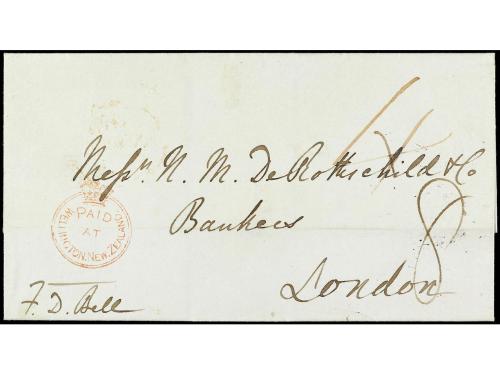 COLONIAS INGLESAS. 1858. NELSON (Nueva Zelanda) a INGLATERRA. Sobre circulado con la marca PAID/AT/NELSON. NEW ZEALAND y tarifa manuscrita "2/6", al dorso fechador de doble círculo de Nelson y llegada. Falta la solapa del dorso.