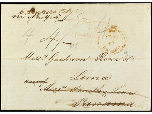 PANAMA. 1850. LIVERPOOL (Inglaterra) a LIMA (Perú). Envuelta encaminada vía New York con marcas en el frente KENYONS/FOREING LETTER/OFFICE y al dorso del Encaminador DENNISTOUN hasta Panamá fue encaminada por SMITH & LEWIS (marca al dorso) quien la depositó al correo británico, marca PAID/AT/PANAMA y tarifa manuscrita "4/-" al dorso fechador de doble círculo de Panamá. RARA. Cert. HOLCOMBE.
