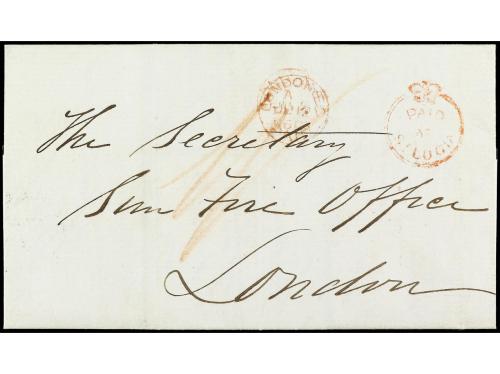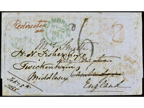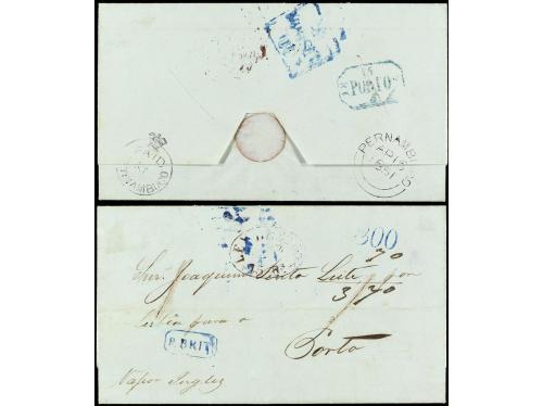 COLONIAS INGLESAS. 1851. PERNAMBUCO (Brasil) a PORTO (Portugal). Carta completa con texto, al dorso marca PAID/AT/PERNAMBUCO y fechador de doble círculo, en el frente marca de entrada a Portugal P. BRIT y tasa de 300 + 70 reis. Muy rara e inusual estampación de la marca en el reverso.