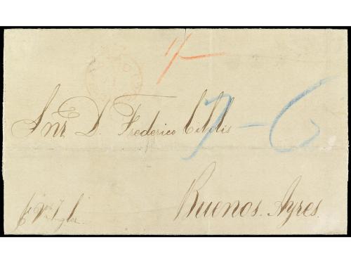 COLONIAS INGLESAS. 1853. CÁDIZ (España) a BUENOS AIRES (Argentina). Carta completa con texto, marca PAID/AT/TENERIFE tipo CC7, tarifa manuscrita "1/-" en el frente fechador de salida de Cádiz y al dorso fechador de doble círculo. PRECIOSA.