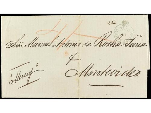COLONIAS INGLESAS. 1864. RÍO DE JANEIRO a MONTEVIDEO. Carta completa con texto, marca PAID/AT/RIO DE JANEIRO en verde y fechador de doble círculo al dorso, tarifa manuscrita "4/-". Muy rara estampación en este color, primer ejemplar que vemos.