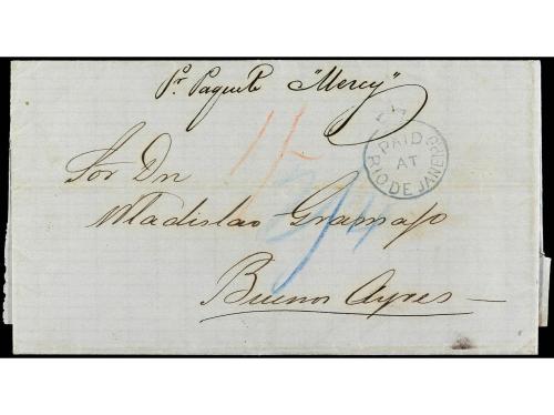 COLONIAS INGLESAS. 1865. PELOTAS (Brasil) a BUENOS AIRES (Argentina). Carta completa con texto, marca PAID/AT/RIO DE JANEIRO en azul y tarifa manuscrita "1/-", al dorso fechador de doble círculo de Río de Janeiro. Preciosa y muy rara estampación en este color.