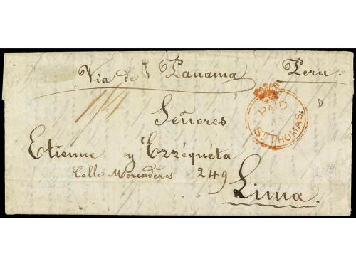 COLONIAS INGLESAS. 1855. ST. THOMAS (D.W.I). Carta completa con texto, marca PAID/AT/ST. THOMAS, CC1 en rojo y tarifa manuscrita "1/4", al dorso marca de entrada VAPOR/LIMA. PRECIOSA.