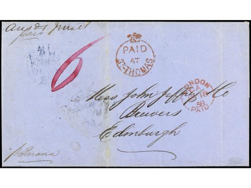 COLONIAS INGLESAS. 1858. ST. THOMAS (D.W.I) a EDIMBURGO (Escocia). Envuelta circulada con la marca PAID/AT/ST. THOMAS CC6 en rojo y tarifa manuscrita "6" al dorso fechador de doble círculo de St. Thomas, tránsito de Londres y llegada. PRECIOSA.