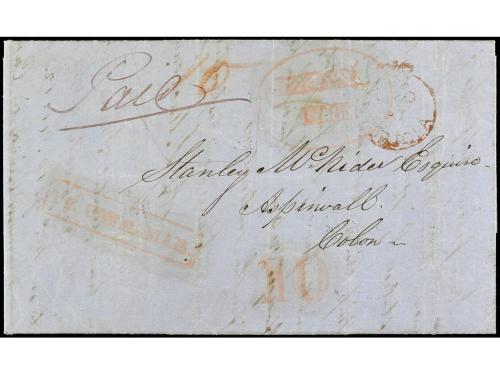 COLONIAS INGLESAS. 1861. TORTOLA (British Virgin Islands) a COLON (Panamá). Carta completa con texto, marca PAID/AT/TORTOLA en rojo tipo CC5 y en el frente marca de entrada PANAMA/DEBE y DE ULTRAMAR más tasa de 10 cts., al dorso fechador británico de Tórtola y tránsito de St. Thomas. EXTRAORDINARIAMENTE RARA, del tipo CC5 de la marca de Tórtola, no se conocen más de tres cartas.