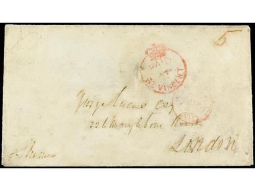 COLONIAS INGLESAS. 1861. SAINT VINCENT a LONDRES. Sobre con la marca PAID/AT/ST. VINCENT en rojo y tarifa "5" y al dorso fechador.
