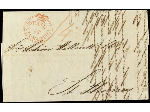 COLONIAS INGLESAS. 1848. SAN JUAN DE PUERTO RICO a CÁDIZ. Carta completa con texto con fechador ISLA DE/PUERTO RICO y FRANCO y marca del correo inglés PAID/AT/SAN JUAN PORTO RICO en rojo y tarifa manuscrita "2/6" tránsito por Londres y Calais. PRECIOSA y muy rara combinación de marcas.