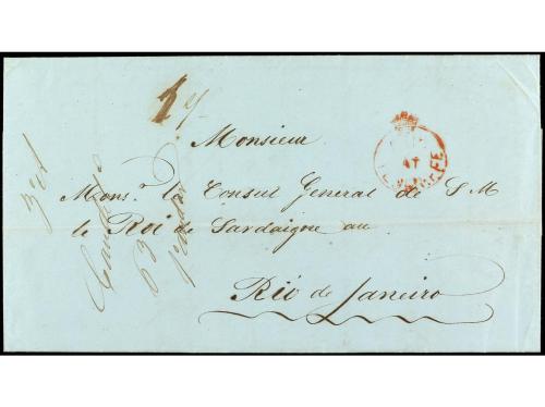 COLONIAS INGLESAS. 1851. SANTA CRUZ DE TENERIFE (Islas Canarias) a RIO DE JANEIRO. Marca PAID/AT/TENERIFE en rojo y tarifa manuscrita de "1/-" al dorso fechador de doble círculo de Sta. Cruz de Tenerife. EXTRAORIDINARIAMENTE RARA. Solo dos cartas conocidas con la estampación de esta marca en rojo y la fecha más antigua conocida de esta marca, además de ser la única dirigida a Brasil.
