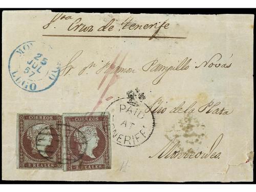 COLONIAS INGLESAS. 1857. MONDOÑEDO (España) a MONTEVIDEO (Uruguay). Frente de carta con parte del reverso circulada con dos sellos de 2 reales castaño lila con mat. parrilla y la marca PAID/AT/TENERIFE tipo CC7 y tarifa manuscrita "1/-" al dorso fechador de doble círculo. Cert. GRAUS.