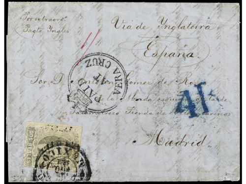 COLONIAS INGLESAS. 1861. VERACRUZ (México) a MADRID. Envuelta circulada con sello de 2 reales gris con mat. fechador de México y marca PAID/AT/VERACRUZ y tarifa manuscrita de "1/-", al dorso fechador de doble círculo de La Habana, tránsito por Londres y llegada, en el frente tasada con 4 reales. MUY BONITA.